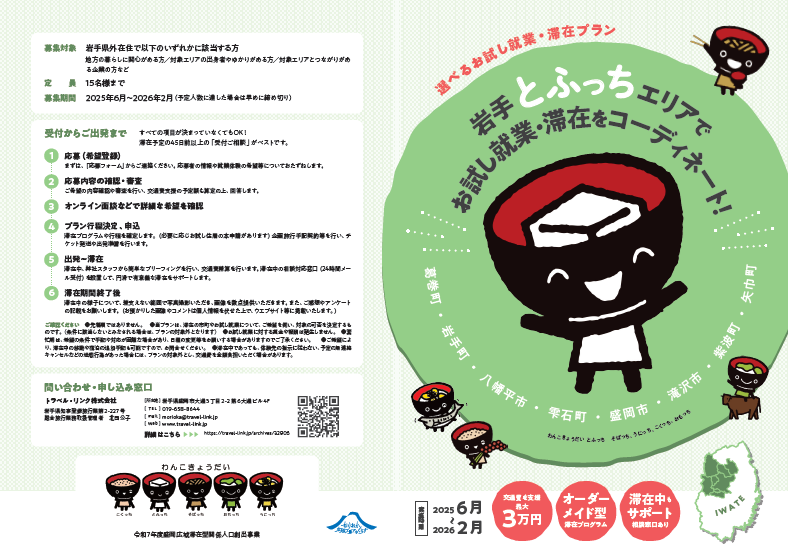 ① 交通費の支援があります▶このプランに参加するために必要な交通費について、3万円を上限に、実費を支援します。当社が手配した旅行のうち、居住地と滞在市町を往復するための移動、滞在拠点と就業体験先を往復するための移動のために交通手段(新幹線や高速バスなど)を利用するための経費が対象となります。支援額は、岩手県の旅費関連法規に基づきます。自家用車を利用する場合は対象となりません。