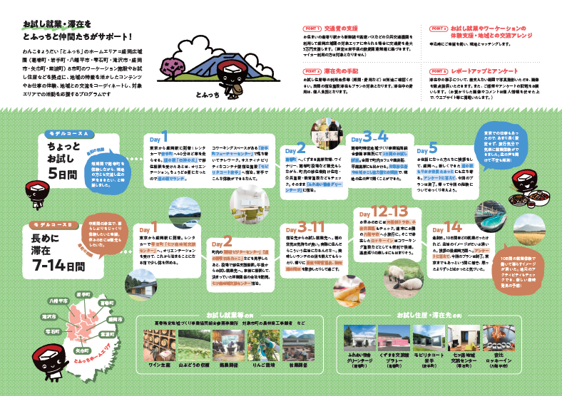 岩手県 盛岡広域振興局管内8市町のお試し住居などを拠点として、地域の特徴を活かした就業体験(ワインやチーズづくり、農林業など)、ワーケーションやテレワーク、さらには地域課題解決の活動などの端緒となる地域での滞在をコーディネートします