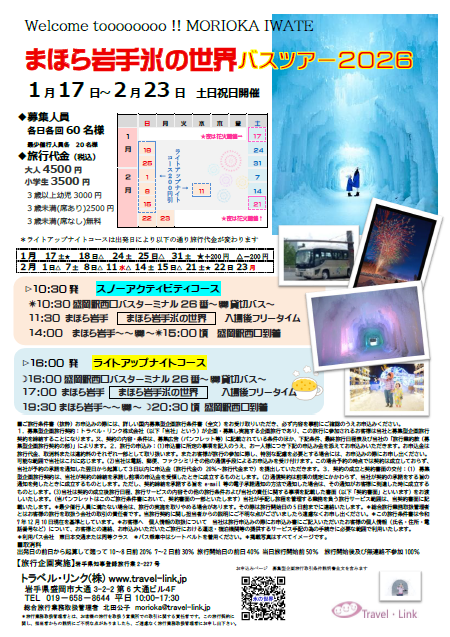 盛岡駅西口発 AM10:30 ==薮川方面== まほら岩手着 AM11:30 ~氷の世界 会場入場 雪遊び・アクティビティなど~ まほら岩手発 PM2:00 ==盛岡駅方面== 盛岡駅西口着 PM3:00